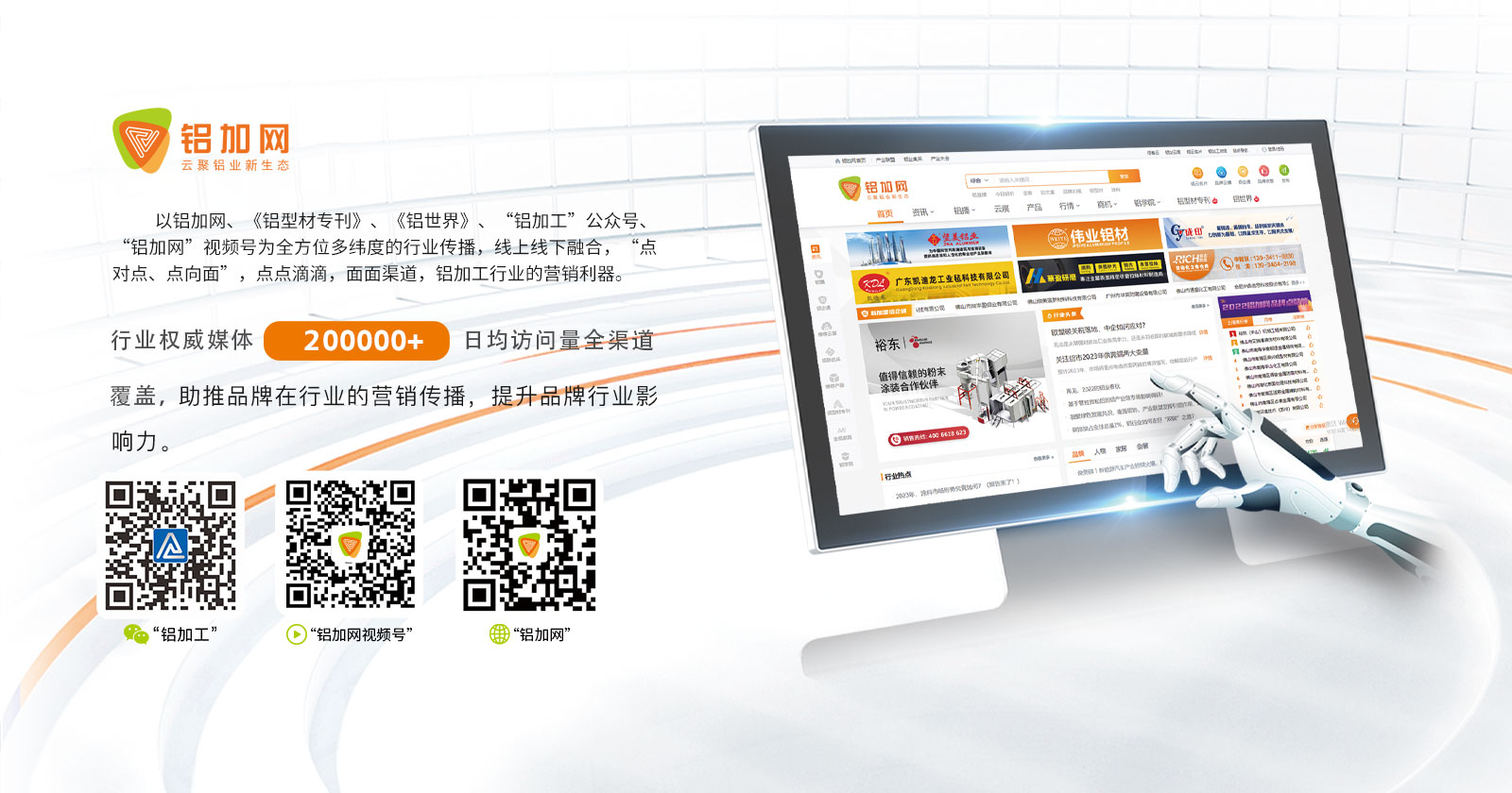 鋁加網(wǎng)(www.albiz.cn)是聞名鋁加工行業(yè)的垂直門(mén)戶(hù)網(wǎng)站,云聚鋁業(yè)新生態(tài),構(gòu)建鋁業(yè)新場(chǎng)景,以albiz.cn 網(wǎng)站為核心,以移動(dòng)云端、鋁加工微信、鋁加網(wǎng)視頻號(hào)、《鋁型材專(zhuān)刊》和《鋁世界》雜志為載體,成為了鋁加工行業(yè)資訊和精準(zhǔn)傳播的首選傳媒。鋁加網(wǎng),采集和發(fā)布全行業(yè)信息資訊,提供線上展覽、在線直播、短視頻、品牌策劃、品牌運(yùn)營(yíng)、品牌傳播等全方位的專(zhuān)業(yè)服務(wù)。